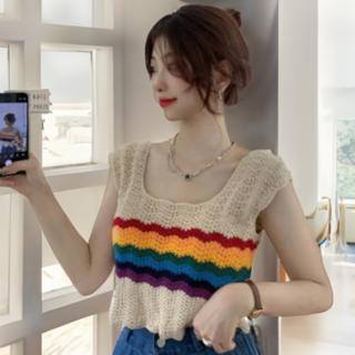 낭만고양이 민소매니트 여름니트조끼 포인트 뷔스티에 크롭 니트탑
