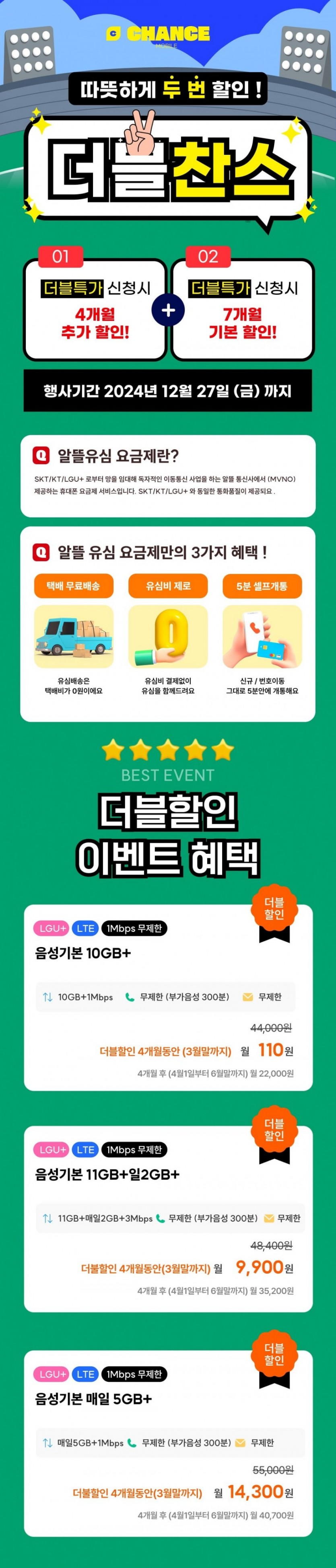 찬스모바일 초특가 작성자 정보 관리자 작성 작성일 2024.12.23 19:53 컨텐츠 정보 1,982 조회 0 추천 0 비추천 목록 본문 찬스모바일쉽고 빠른 개통, 통신비 절감의 찬스!https://chancemobile.co.kr/view/distributor/phone_plan_distributor.aspx?poscd=bcd188635790aefcd14ba77b3f85b1c0 알뜰폰 10GB+1MPS 3월30일까지 100원알뜰폰 11G+2GB+3MBPS 3월30일까지 9900원 . 100기가+5mps . 14000원 . 3월까지쓰고 4월에 번호이동 하심 될거 같네요.그리고 테더링 필요하신분은 엘지 특성상 E심 섞어서 하는 것도 추천 드립니다. E심 개통도 가능하다고합니다.#viral#fyp#tiktok#comedy 0 추천 0 비추천 SNS 공유 관련자료 링크 https://chancemobile.co.kr/view/distributor/phone_plan_distributor.aspx?poscd=bcd188635790aefcd14ba77b3f85b1c0 807 회 연결 이전 리쏘 영원씨 안마의자 작성일 2025.02.08 21:35 다음 “나야, 흑백요리사” 출연진들의 식당 리스트 총정리! 작성일 2024.10.11 16:23 댓글 0 등록된 댓글이 없습니다. 로그인한 회원만 댓글 등록이 가능합니다. 목록