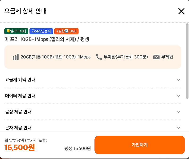 월 16,500원 평생 요금제 30GB(결합시)+1Mbps