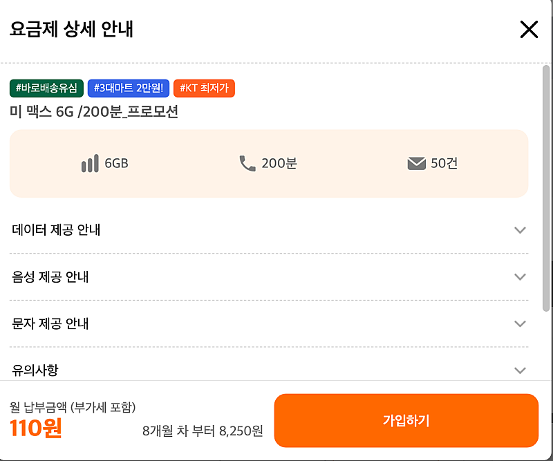 월 110원 요금제 8개월간 880원인데
