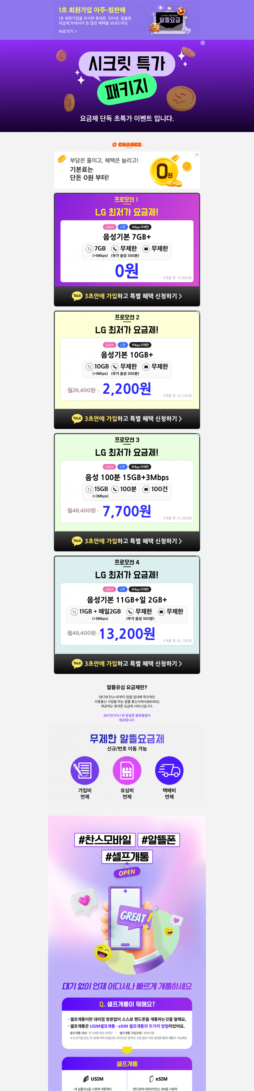 [자사몰] 유플러스 알뜰폰 7GB+1Mbps 0원 / 10GB+1Mbps 2,200원